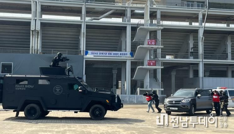 또한 이번 훈련에는 테러 발생 시 현장지휘관의 신속하고 적극적인 초동조치 및 위기대응 능력을 강화하고자 전남경찰청 도내 22개 경찰서장 및 경비과장이 참관했다.