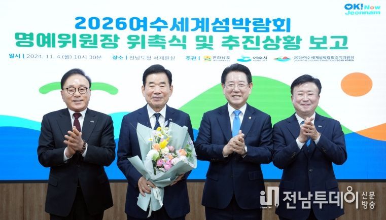 전남투데이 김완규 기자 | 2026여수세계섬박람회 조직위원회(위원장 : 김영록 전라남도지사, 정기명 여수시장, 박수관 YC_TEC 대표)는 4일 전라남도청 서재필실에서 김진표 전 국회의장을 명예위원장으로 위촉했다