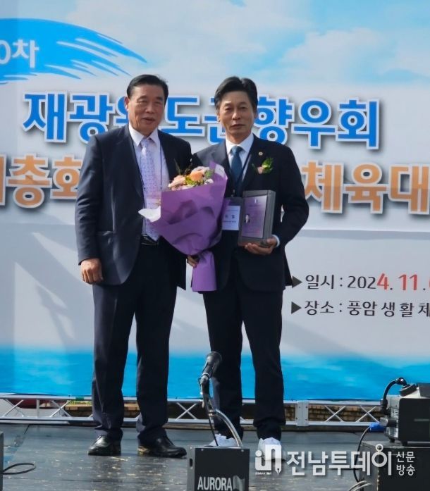 전남투데이 김완규 기자 | 전라남도의회 이철 부의장(더불어민주당, 완도1)이 지난 11월 2일 광주시 풍암생활체육공원에서 열린 ‘제40차 재광완도군향우회 정기총회 및 한마음체육대회’에서 ‘자랑스런 완도인 상’을 수상했다.