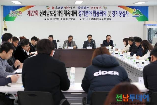 영암군(군수 전동평)에서는 지난 1월 8일 영암종합운동장 회의실에서 제27회 전라남도장애인체육대회의 성공개최를 위해 종목별 경기단체 임원 및 운영진 등 관계자 70여명이 참석한 가운데 경기분야 합동회의를 개최했다.