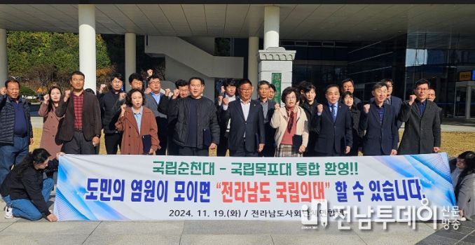전남투데이 김완규 기자 | 전라남도 사회단체연합회는 19일, 전남도청 정문 표지석에서 목포대와 순천대의 대학통합 합의를 환영하고 지지하는 성명문을 발표하고, 통합의대 설립을 위해 힘껏 지원할 것을 약속했다.