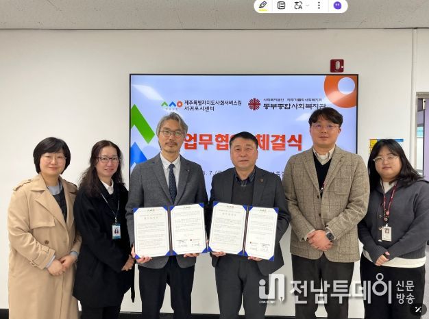 전남투데이 천세두 기자 | 제주특별자치도사회서비스원 서귀포시센터(센터장 송장희)와 서귀포시 동부종합사회복지관(관장 오명복)은 7일 서귀포시 지역소멸 예방과 저출산 ․ 고령사회 대응을 위한 업무협약 체결했다.