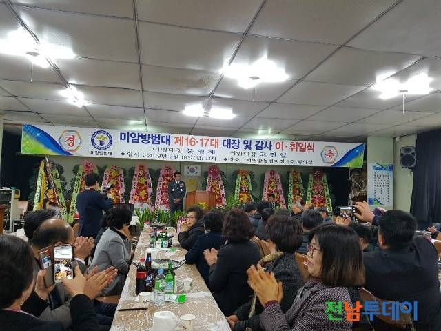 (전남투데이 김연자 기자) 미암면방범대는 지난 18일 서영암농협 미암지점 2층 회의실에서 방범대원, 영암경찰서장, 영암군의회 의장 및 의원, 미암면 기관사회단체장 등 100여명이 참석한 가운데 미암면 방범대 대장 이·취임식을 가졌다.