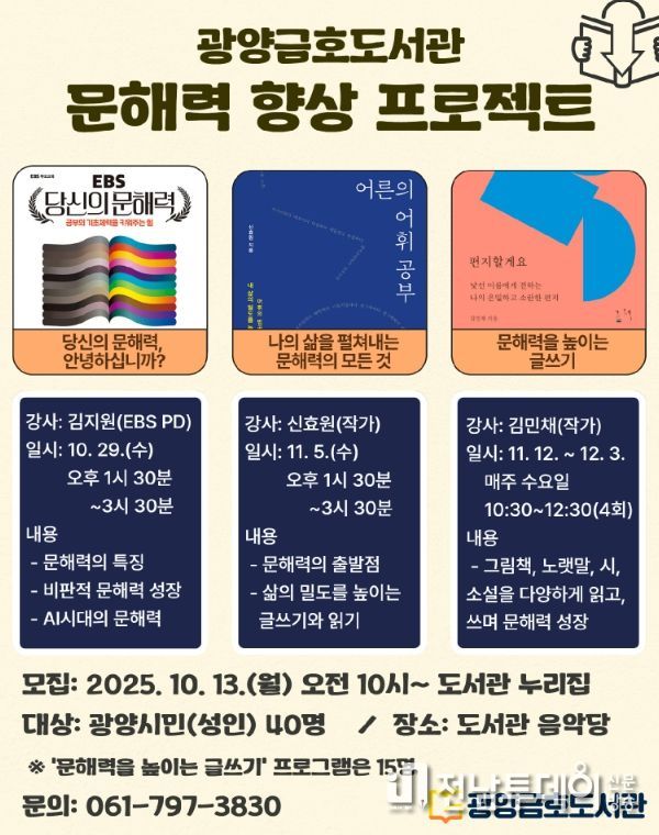전남투데이 조평훈 기자 | 광양금호도서관이 성인들의 문해력 향상을 위해 오는 10월 29일부터 12월 3일까지 매주 수요일 시민독서학교를 운영한다.