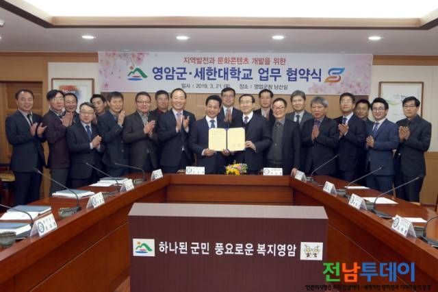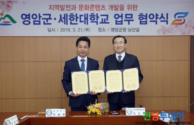 (전남투데이 김연자 기자) 영암군(군수 전동평)과 세한대학교(총장 이승훈)가 지난 21일, 영암군청 낭산실에서 지역발전과 문화 콘텐츠 개발을 위한 업무 협약을 체결했다.