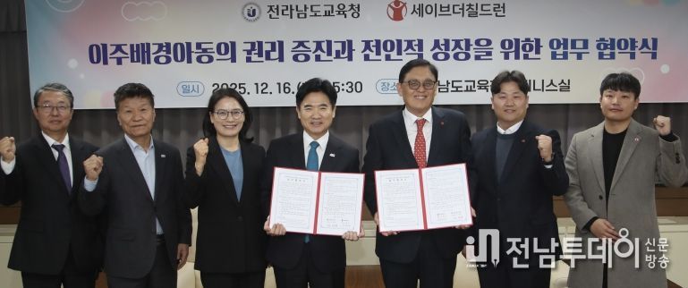 전남투데이 김용희 기자 | 전라남도교육청은 16일 청사 비즈니스실에서 세이브더칠드런(총장 정태영)과 ‘이주배경아동의 권리 보장과 전인적 성장을 위한 업무협약’을 체결했다.