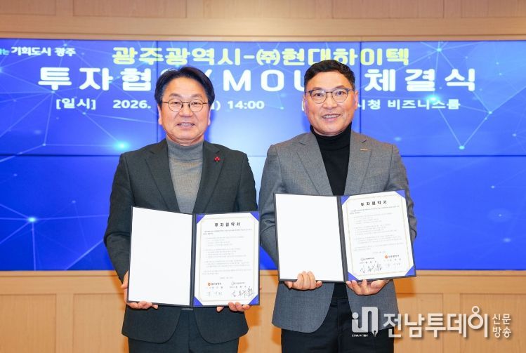 광주광역시는 ㈜현대하이텍과 26일 시청 비즈니스룸에서 ‘신규 차종 부품 제조공장 신설을 위한 투자협약’을 체결했다.