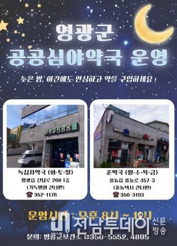 이번에 지정된 공공심야약국은 요일별로 운영되며, ▲녹십자약국은 화·토·일요일(영광읍 신남로 260 1층), ▲준약국은 월·수·목·금요일(홍농읍 홍농로 457-3)에 운영된다.