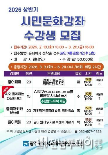 전남투데이 김경민 기자 | 광주광역시교육청중앙도서관은 오는 3월 3일부터 6월 24일까지 도서관 배움터실 등에서 ‘2026년도 상반기 시민문화강좌’를 운영한다.
