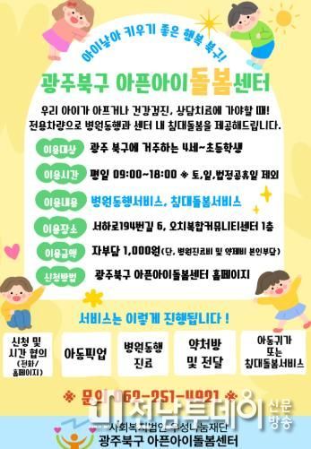 사업 대상은 북구 거주 만 4세~12세 아동이며 아픈아이 돌봄센터 누리집 또는 유선을 통해 신청할 수 있다.