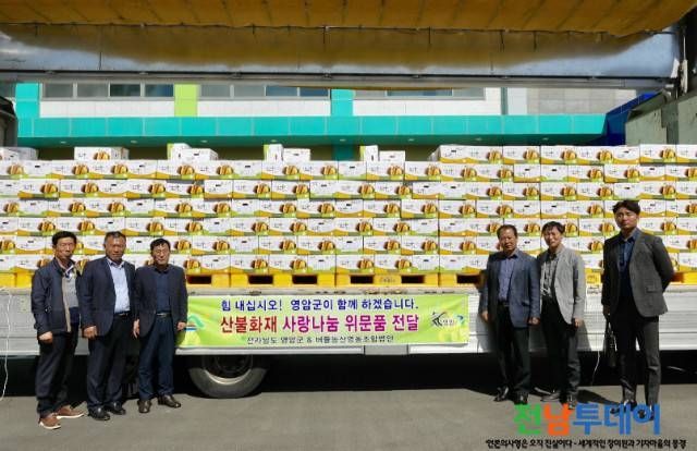 ❍ 이번 방문은 버들농산영농조합법인 류충연대표가 강원도 산불 소식을 듣고 지난 가을에 수확하여 냉장고에 보관중인 영암군 의 지역특산품인 황토 고구마1,000박스(10kg) 4천만원 상당을
