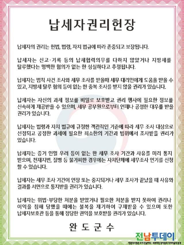 [전남투데이 김오례기자]완도군(군수 신우철)은 2019년 1월 납세자보호관을 의무 배치한데 이어, 납세자권리헌장을 전면 개정하여 공표했다.