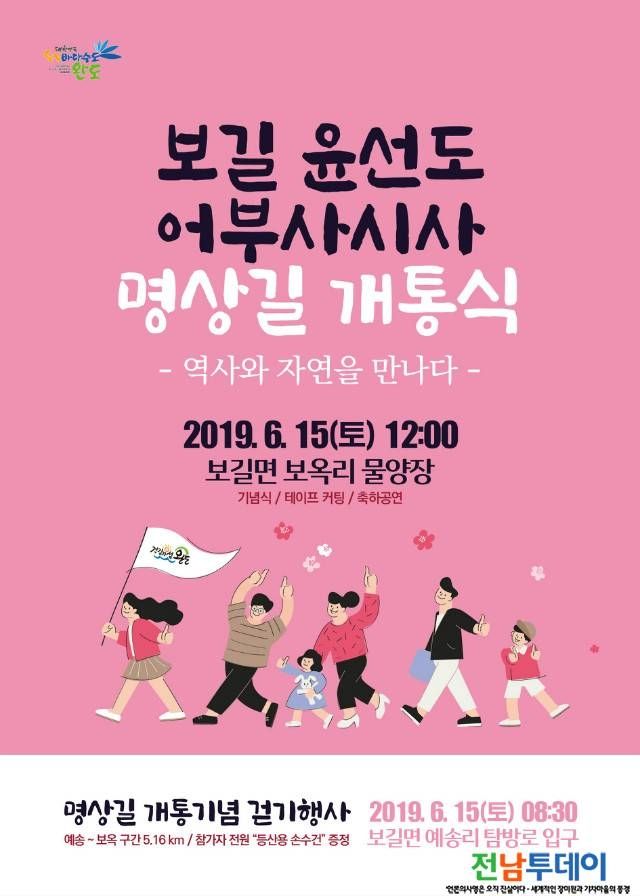 [전남투데이 김오례기자]역사와 문화가 살아 숨 쉬고, 사람과 자연이 하나가 되는 보길도에 ‘윤선도 어부사시사 명상길’이 개설됨에 따라 오는 6월 15일 12시, 보옥리 물양장에서 ‘보길 윤선도 어부사시사 명상길’ 개통식을 개최한다고 밝혔다.