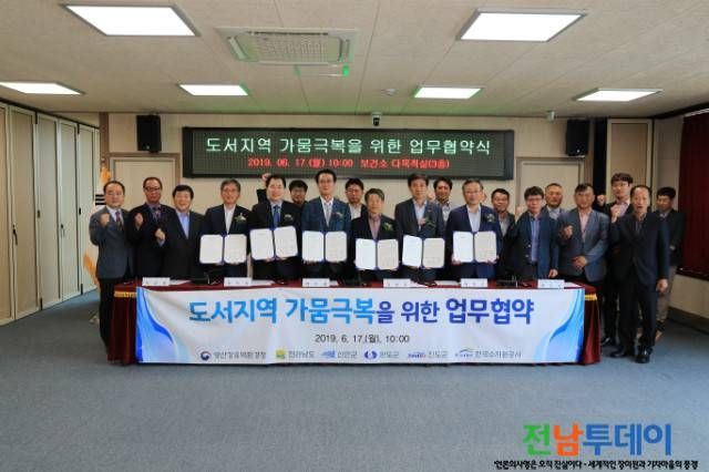 [전남투데이 김오례기자]매년 반복되는 도서지역 가뭄 해결을 위해 환경부 산하 영산강유역환경청의 주제로 전라남도, 완도군, 진도군, 신안군, 한국수자원공사(금영섬권역본부)는 17일 신안군청에서 업무 협약식을 체결했다.