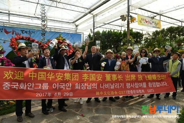 최근 사드배치 문제로 한중관계와 교류가 얼어붙은 가운데 중국내 대표 투자그룹이자 제조업, 호텔업등의 종합 그룹인 화안그룹 관계자 일행이 친환경 생태관광을 벤치마킹하기 위해 4월 29일(토) 나비따라 꽃길따라 함평으로! 함평 나비축제장을 방문하였다.