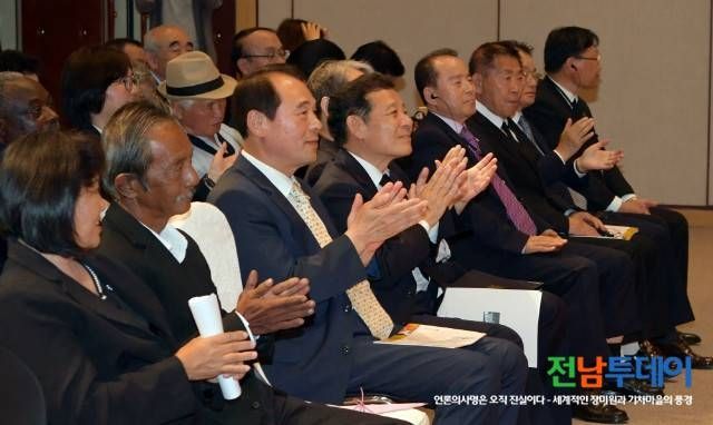 윤장현 광주광역시장(왼쪽 네번째)이 18일 오후 서구 5·18기념문화센터 2층 대동홀에서 열린 제37주년 5·18 민주화운동 기념 '2017광주 인권상' 시상식에 참석해 식전 공연을 관람하며 박수를 치고 있다.