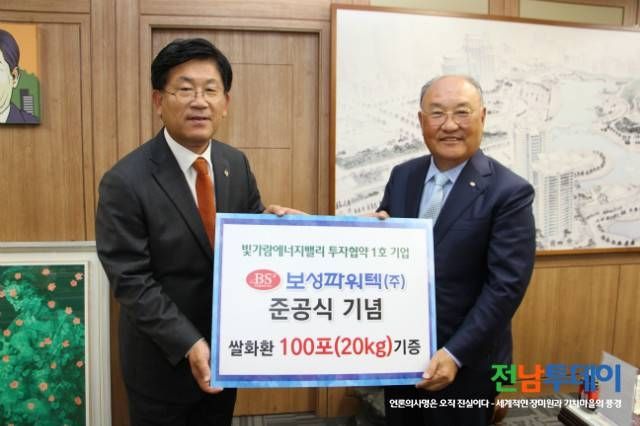 나주 혁신도시 에너지 밸리의 투자협약 1호 기업인 보성파워텍(회장 임도수)이 나주공장 준공을 기념해 저소득층을 위한 사회공헌활동의 일환으로 백미 100포(1포 당 20kg)를 나주시에 기증했다.