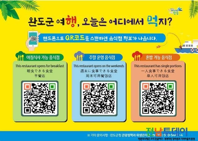 [전남투데이 김오례기자]완도군(군수 신우철)은 지역을 찾는 관광객들에게 음식점 정보를 편하게 알려줄 수 있는 음식점 QR코드 포스터를 제작하여 관광지 및 다중이용시설에 부착했다.