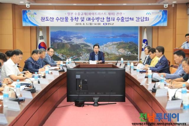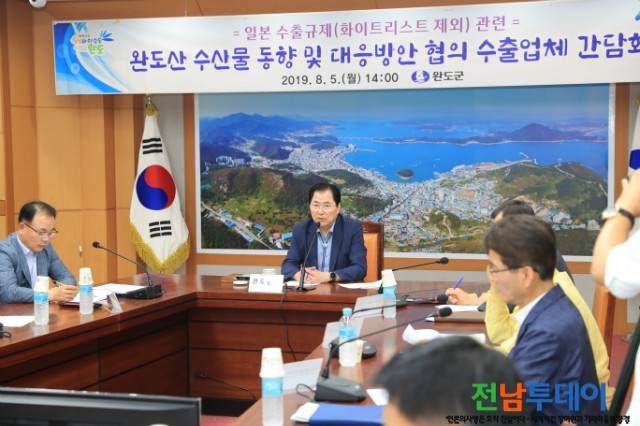 [전남투데이 김오례기자]완도군은 지난 5일 군청 상황실에서 신우철 완도군수와 조인호 군의회의장, 이범성 군의원, 수출업체 관계자 등이 참석한 가운데 일본의 수출 규제 대응 방안 마련을 위한 간담회를 가졌다.