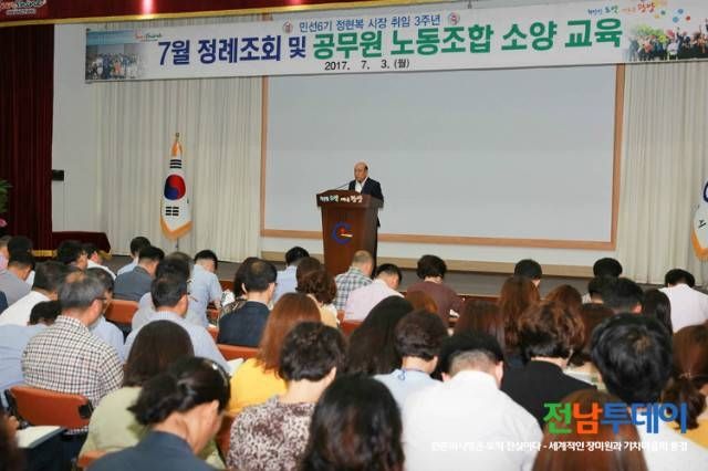 정례조회 후에는 전국통합공무원노동조합 광양시지부에서 전민련 공동의장을 역임한 김승호 강사를 초빙해 ‘문재인 정부의 공직사회 변화 및 대응 방안’이라는 주제로 공무원노조 교육이 이어졌다.