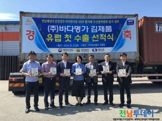 [전남투데이 김오례기자]전남해양수산창업투자지원사업 마케팅 지원의 일환으로 벨기에 브뤼셀 수산물 박람회(2019년 5월 7~9일)에 참가하여 100만 불 수출 계약을 체결한 ㈜바다명가는 지난 2일, 완도산 구운 김을 폴란드에 첫 수출하는 큰 성과를 이뤘다.