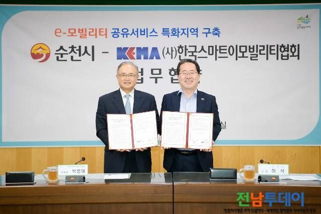 【전남투데이 구정준 기자】순천시는 지난 8월 12일(월) 순천시청 소회의실에서 한국스마트이모빌리티협회와 ‘이모빌리티 공유서비스 특화지역 구축’을 위한 업무협약 체결했다고 밝혔다.