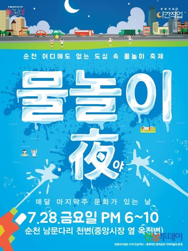순천시는 문화예술야시장 ‘야간작업’을 오는 28일 남문다리 옥천변에서 운영한다. 7월 문화가 있는 날 야간작업은 ‘물놀이夜(야)’를 주제로 28일(금) 저녁 6시부터 10시까지 남문다리 옥천변에서 개최되며, 물총싸움 옥천대첩, 야외물놀이 풀장, 수상무대 야외공연, 물놀이 퍼포먼스, 시원한 생맥주와 먹거리 등 다채로운 즐길거리들이 펼쳐진다.