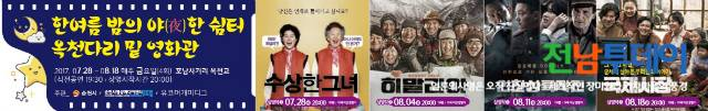 옥천 다리밑 영화관은 7월 28일부터 8월 18일까지 매주 금요일 저녁 8시에 총 4편의 영화가 상영될 예정이며, 시민 누구나 무료로 관람할 수 있고 영화 상영 전에는 미니콘서트인 아고라 공연도 함께 펼쳐져 옥천변 문화 쉼터로 탄생된다.