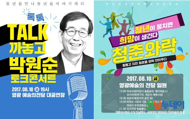 영광군(군수 김준성)은 8. 18.(금) 저녁 7시 영광예술의전당 대공연장에서 ‘청년으로 산다는 것’이라는 주제로「Talk까놓고 박원순 토크 콘서트」를 개최한다고 밝혔다.