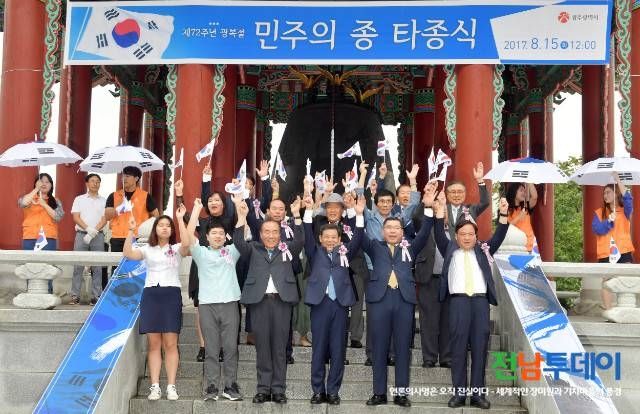 윤장현 광주광역시장이 제72주년 광복절인 15일 오전 동구 국립아시아문화전당 앞 민주의 종각에서 열린 광복절 기념 '민주의 종' 타종식에 참석해 이은방 광주시의회 의장, 장휘국 광주시교육감, 광복회원 등과 함께 타종을 하고 있다