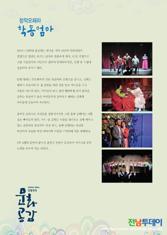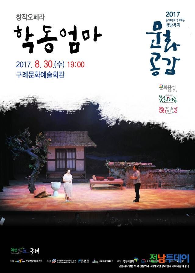 구례군이 유치하고 한국문화예술회관연합회에서 주관하는 ‘2017 문예회관과 함께하는 방방곡곡 문화공감’ 사업의 일환으로 오는 30일 저녁 7시에 구례문화예술회관에서 창작오페라 「학동엄마」 공연을 한다.