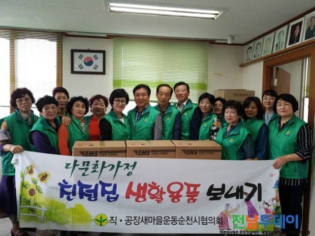 【전남투데이 구정준 기자】순천시새마을회(회장 이흥우)에서는는 매년 다문화여성 친정집에 생활용품 보내주기 사업을 추진하고 있다. 각 가정에서 가져와 모은 생필품과 식료품등을 구입하여 다문화가정의 친정집에 국제운송편으로 보내는데, 올해는 순천시새마을협의회(회장 김영찬), 새마을부녀회(회장 백영자), 직장새마을운동순천시협의회(회장 오인규) 회원들의 십시일반의 참여로 더 풍성한 행사가 됐다.