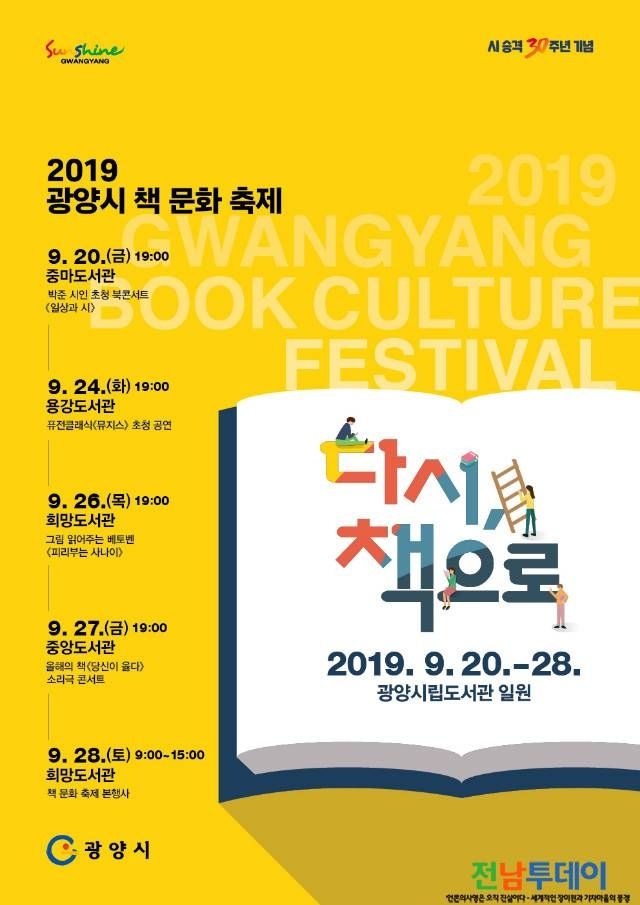 【전남투데이 구정준 기자】광양시는 오는 20일(금)~28일(토) 광양시립도서관과 광양희망도서관 일원에서 ‘2019 광양시 책 문화축제’를 개최한다고 밝혔다.