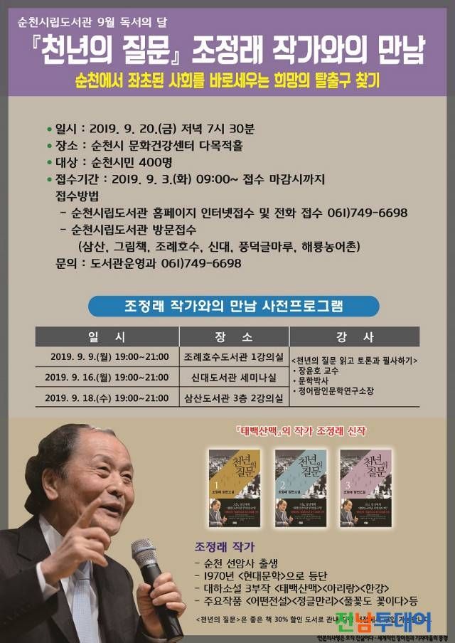 20일(금)에는 순천만국가정원 컨퍼런스 홀에서 도서관 관계자 100여명이 모이는 어린이 문화 포럼을 시작으로 독립서점 ‘지금의 세상’과 인디밴드 ‘나띵대열’이 함께하는 고민상담 북 콘서트 ‘책 음악과 만나다’가 진행되며, 문화건강센터 다목적홀에서는 순천출신 조정래 작가와 함께 신작 ‘천년의 질문’에 대한 이야기를 나눌 예정이다.