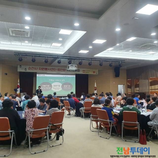【전남투데이 구정준 기자】순천시(허석 순천시장)는 지난 18일(수) 시청 대회의실에서 시민 100여명이 참여한 가운데 순천시 자원봉사센터 법인전환에 대한 토론을 진행했다고 밝혔다.