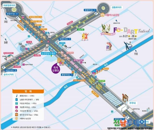 한편푸드앤아트페스티벌 기간 중앙로 일원의 교통이 전면 통제됨에 따라 교통 통제로 인한 교통 혼잡 문제를 해소하기 위해 낮 12시부터 오후 11시까지 3코스로 나눠 45인승 5대와 25인 버스 5대 등 총 10대로 운행하며, 500원만 주면 누구나 이용이 가능하다.