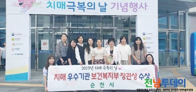 【전남투데이 구정준 기자】순천시는 지난 20일 영광 예술의 전당에서 열린 2019년 제12회 치매극복의 날 기념식에서 치매프로그램 우수기관으로 선정돼 보건복지부장관상을 수상했다.