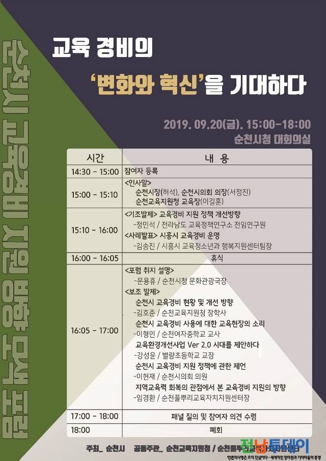 【전남투데이 구정준 기자】순천시에서는 순천교육지원청, 순천풀뿌리교육자치지원센터와 지난 20일(금) 시청 대회의실에서 ‘교육경비 변화와 혁신을 기대하다’를주제로 교육경비포럼을 개최했다.