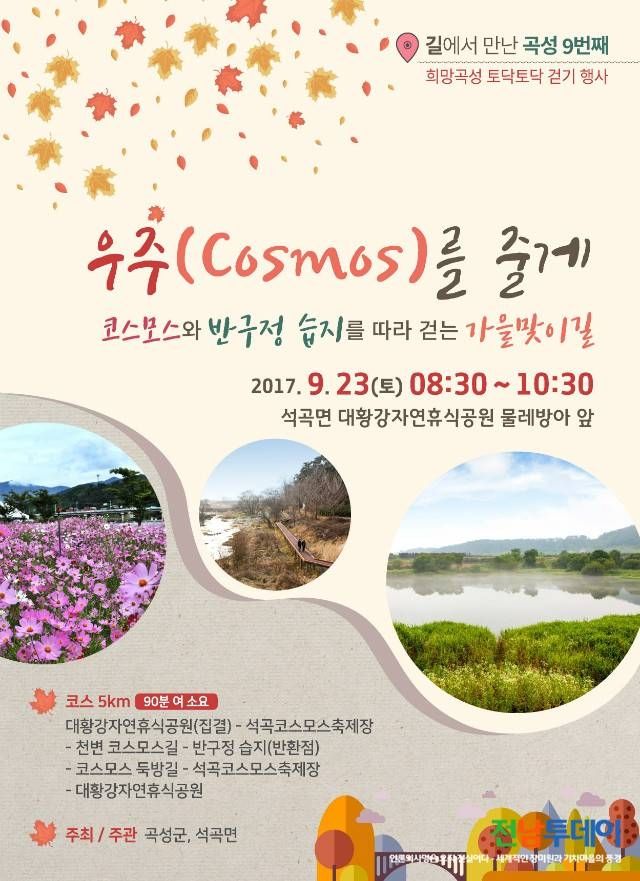 어느덧 아홉 번째를 맞이한 토닥토닥 걷는 길은 축제장 인근에 가득 찬 코스모스길과 함께 아름다운 습지길을 따라 걷는 5km 풍성한 가을맞이 길<부제‘우주(Cosmos)를 줄게’>로 진행된다.