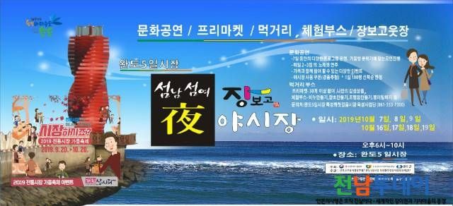 [전남투데이 김오례기자]완도군은 제18호 태풍 ‘미탁’의 직‧간접적인 영향으로 인해 완도5일시장 2019 섬남섬여들의 가을밤 장터 ‘장-보고 야시장’ 개장 일정을 변경한다고 밝혔다.