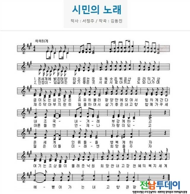 ‘광양 시민의 노래’는 1989년 서정주 작곡, 김동진 작사로 제작되어 1995년 동광양시와 광양군이 통합하면서 ‘동광양’이 ‘큰광양’으로 개사되어 현재까지 불리어 오고 있다.