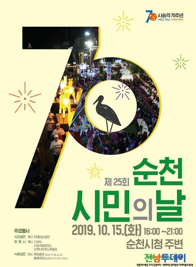 【전남투데이 구정준 기자】순천시는 ‘시 승격 70주년, 새로운 순천 행복한 동행’을 주제로 제25회 순천시민의 날 행사를 오는 10월 15일(화) 오후 3시부터 시청 주변에서 개최한다고 밝혔다.