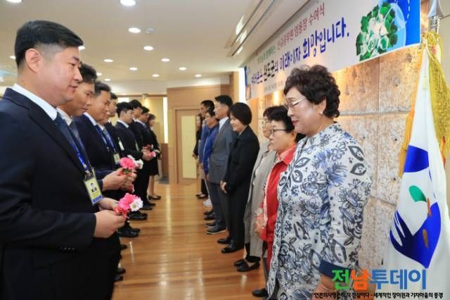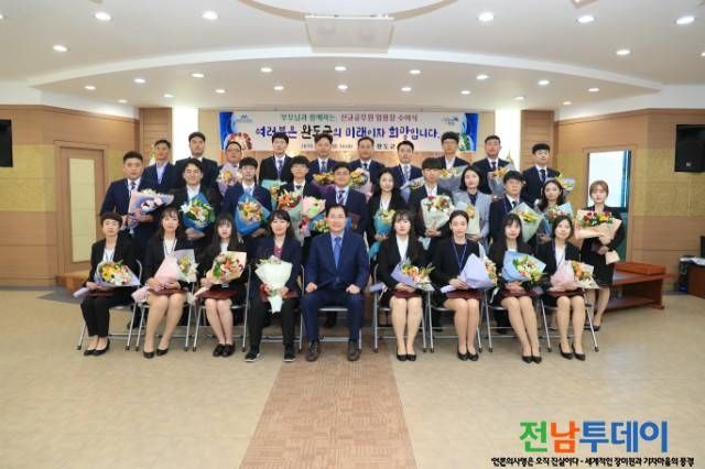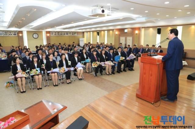 신우철 완도군수를 비롯해 새내기 공무원과 가족, 선배 멘토 등 100여 명이 참석한 가운데 진행된 임용식은 임용장 수여와 공무원 선서, 부모님께 드리는 감사의 편지 낭독, 카네이션 전달 순으로 진행됐다.