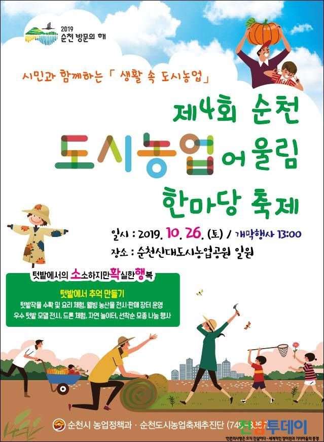 【전남투데이 구정준 기자】순천시(시장 허석)는 오는 10월 26일(토) 신대도시농업공원(해룡면 신대리 2137)에서 ‘시민과 함께하는 생활 속 도시농업’을 주제로 ‘제4회 순천 도시농업 어울림 한마당’ 행사를 개최한다고 밝혔다.