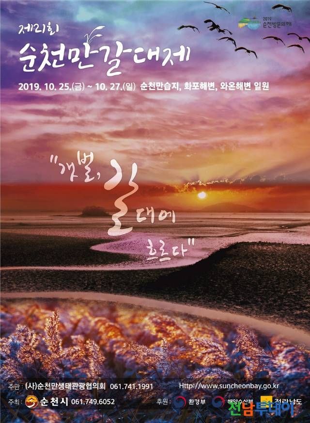 【전남투데이 구정준 기자】생태축제의 전국적 대명사인 ‘순천만 갈대제’가 ‘갯벌.. 갈대에 흐르다’를 주제로 오는 10월 25일(금) ~ 27일(일)까지 3일간 순천만을 둘러싼 순천만습지와 화포해변, 와온해변 일대에서 개최된다.