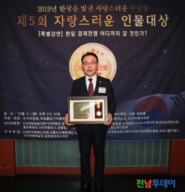 [전남투데이 김오례기자]완도군의회 조인호 의장이 자랑스러운 인물대상 조직위원회에서 주최하고, 국회출입기자클럽, 한국언론연합회, 대한방송뉴스, 선데이뉴스, 코리아명사포럼에서 주관한 2019년 제5회 한국을 빛낸 자랑스러운 인물대상에서 ‘올해의 대한민국 의회발전’ 부문의 대상을 수상했다.