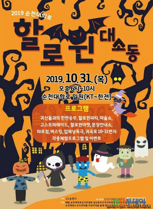 【전남투데이 구정준 기자】오는 10월 31일(목) 오후 6시부터 10시까지 순천대학로 일대(KT~한전입구)에서 ‘할로윈 대소동’이라는 주제를 가지고 할로윈 행사를 개최한다.