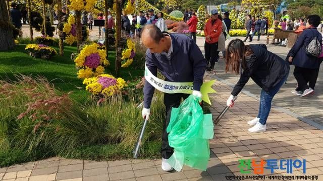 [전남투데이 서영록 기자]2019 대한민국 국향대전이 폐막을 나흘 앞둔 30일, 함평군 해보면 기관사회단체와 공무원, 지역주민 등 60여 명이 축제장 곳곳에서 환경미화 봉사활동을 펼치고 있다.