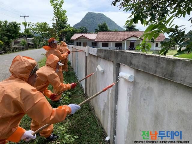 이번 연수단은 라오스 방비엥 소재 나통초등학교(nathong primary scool / 교장 Mr. Phoumme khummavong) 담장 페인트칠 봉사활동을 펼치고 운동복 100벌과 학용품(연필,공책) 100점, 금일봉을 교장에게 전달했다.
