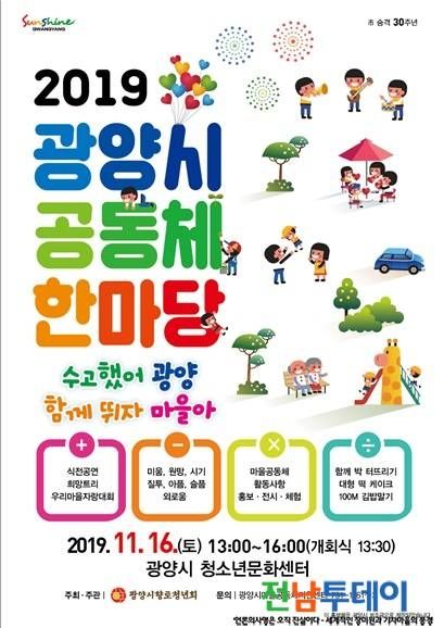 【전남투데이 구정준 기자】광양시는 오는 16일(토) 오후 1시 광양시청소년문화센터에서 ‘2019년 광양시 마을공동체 한마당’ 행사를 개최한다고 밝혔다.